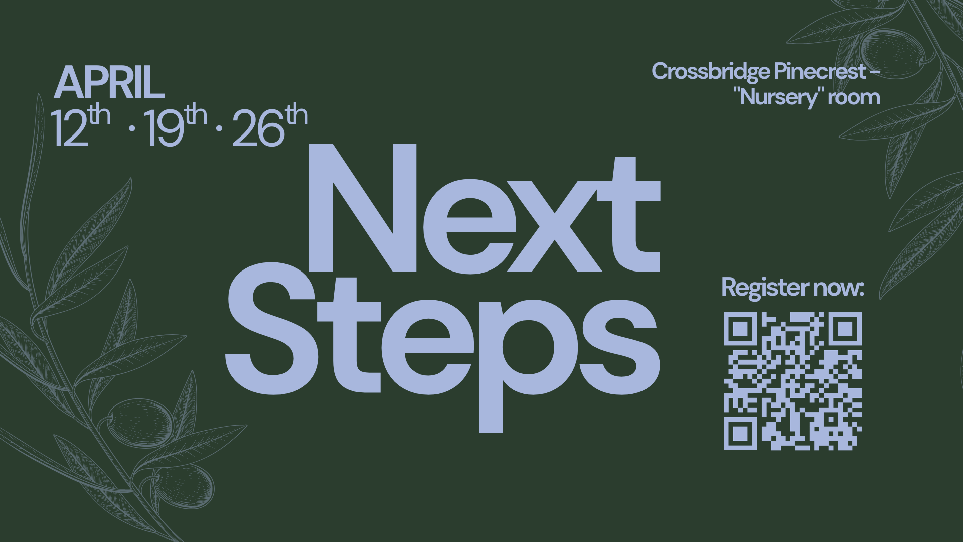 We have another opportunity to participate in Next Steps coming up in April! Next Steps is a 3-session pathway designed to help you move from simply attending Crossbridge to actively participating in the life and mission of our church. Register today for classes April 12, 19, and 26, at 11 AM in the Nursery classroom.