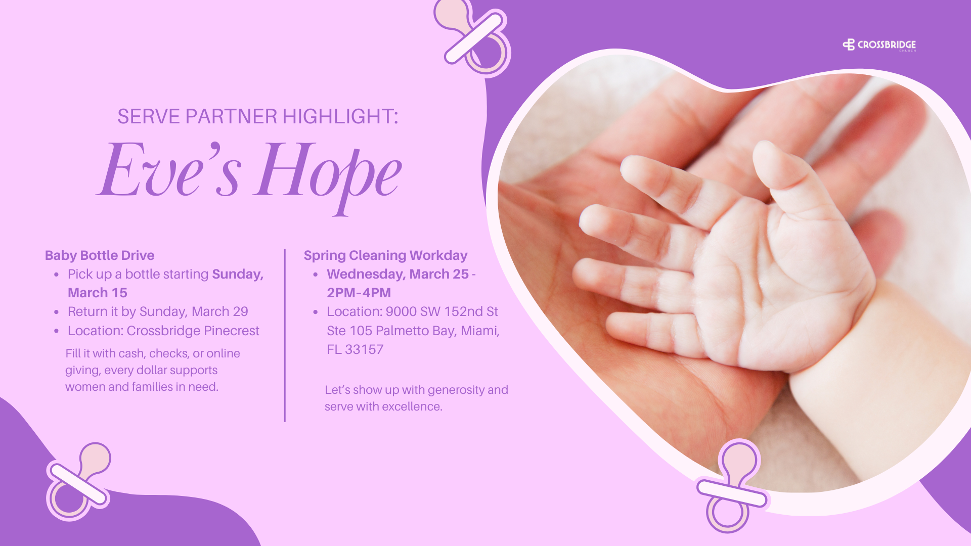 A Crossbridge Serve Partner, Eve’s Hope offers women medical services and factual information regarding their pregnancy options. We have some opportunities to give and serve in the coming month. Mark your calendars for Sunday, March 15, and pick up a baby bottle to fill with donations. We also have a spring cleaning Work Day Wed., March 25. Contact Cathy if you want to participate!